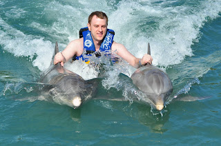 We swam with dolphins. It's hard to remember anything else in a day when you swim with dolphins. Some people have always wanted to do it, I personally have not thought too much about ever doing it, but when it was all said and done...it was awesome! They taught us some signs for doing different things with the dolphins and we were amazed how easy they were and how the dolphins did all the work. Outside of that, we ate a relaxing lunch with Scott and Emily, walked the beach, swam in the pool, had dinner with Scott/Emily and Randy/Crystal for about 3 hours and then sat around the bonfire and band and had dessert and played cards. One funny thing that happened at the bonfire is Scott mentioned at dinner he had received a prescription for a 10-day trial to wear contacts and saved them for this trip so he could wear these really cool sunglasses that he's been wanting to wear. He had them on at the end of dinner and then it was dark when we went down to the bonfire. He was trying really hard to see the menu for dessert, leaning over to use the light of the fire to see the menu. Lindsey leaned forward and said, "You might be able to see it if you'd lose the sunglasses." Hilarious. -T